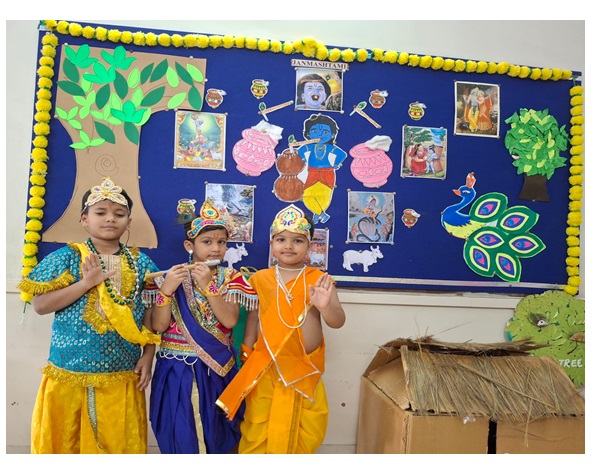 Children celebrated Janmashtami with great enthusiasm and zest. Children performed a stage show depicting Krishna's life and also enjoyed matki fod. Children also performed a skit with different leela such as Krishna' s birth, Naagdaman, Govardhan Parvat leela etc. They have also understood the importance of " Bhagwat Geeta".