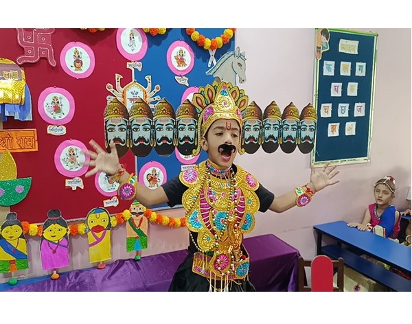Navratri - symbolizes victory of goodness over evil.It is a vibrant festival which showcases our rich culture of traditional music and dance. Little khelaiyas in traditional dresses enjoyed playing Garba with full of devotion.Our Sr.K G. students learned about nine forms of Maa Durga and also performed a skit on Ramayan depicting the various characters of the same.